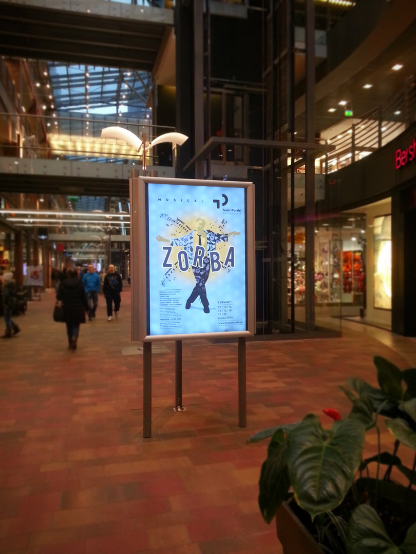 Dla Teatru Polskiego w Bielsku-Białej wykonaliśmy podświetlane plakaty reklamowe typu backlight, które spotkać można było w galerii Sfera. Reklama backlit to wysokiej jakości materiał PCV, który idalnie przepuszcza i rozprasza światło. Dlatego największy efekt osiąga ona po zmroku, gdy podświetlenie znajdujące się za grafiką intensyfikuje nasycenie kolorów i obrazu. Materiał używany do tego rodzaju reklam jest wytrzymały na rozdarcia, odporny na wilgoć, promienie UV oraz różnice temperatur.