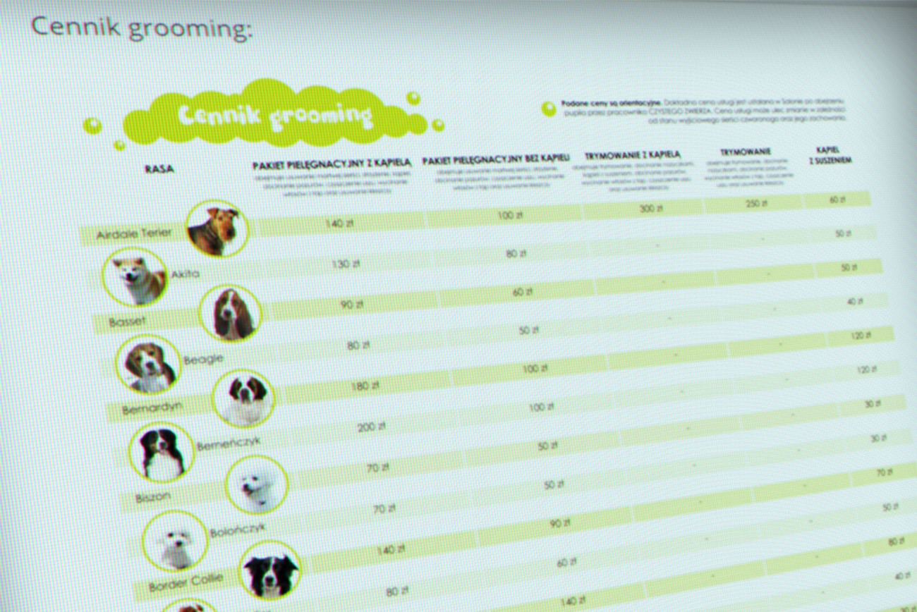 Przygotowaliśmy kompletną identyfikację wizualną dla firmy „Czysty Zwierz”. Realizacja obejmowała stworzenie brandingu, graficzne koncepcje materiałów firmowych, druk materiałów promocyjnych (katalogi, wizytówki, ulotki), zewnętrzne i wewnętrzne elementy wizualne firmy.